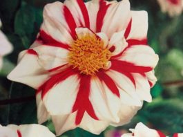 Dahlia 'Canadian Celebration' is a striking white dahlia with red stripes that is expected to...
